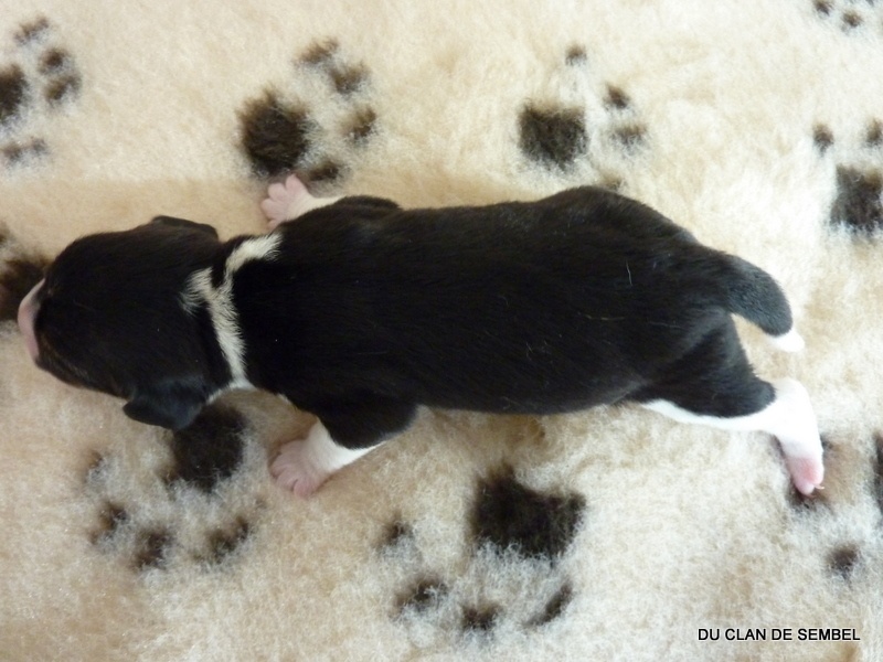 Mise bas naturelle. Pas de problème à la mise bas. Portée très homogène. Les chiots ont tous une majorité de noir pour l'instant et devraient donner des chiens à joli manteau noir à l'âge adulte.